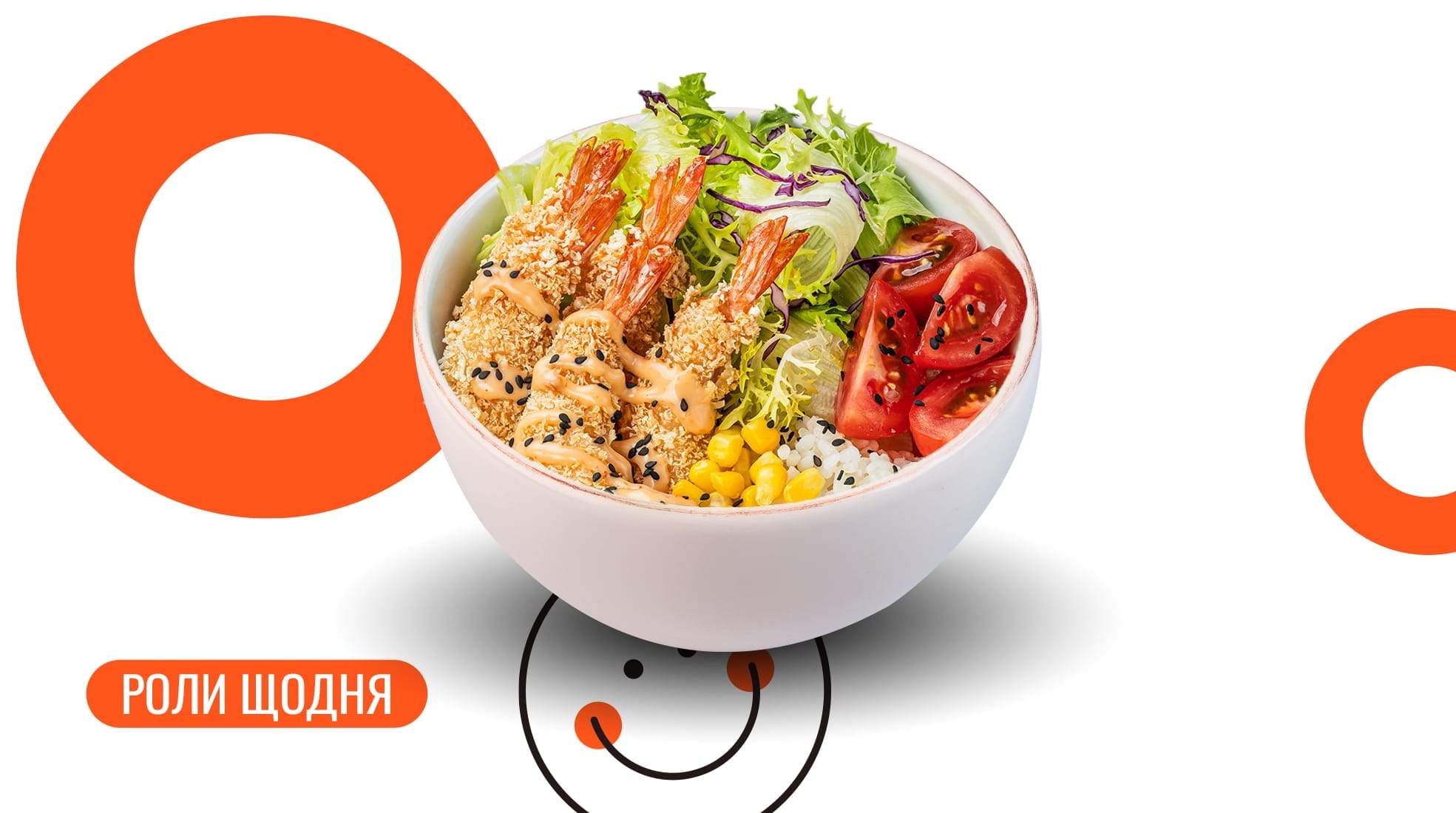 Рис, креветка в сухарях панко, помідор, кукурудза, мікс салату, соус Тонкацу, соус Ланч Кінг, соус Світ Чилі, кунжут, олія