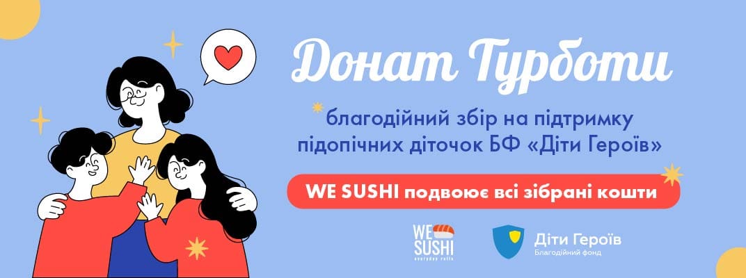 We Sushi вместе с БФ «Діти Героїв» собирает средства в поддержку детей, потерявших одного или обоих родителей из-за полномасштабного вторжения страны-агрессора в Украину. Собранные средства помогают им учиться, развиваться и получать психологическую, социальную и медицинскую поддержку.
